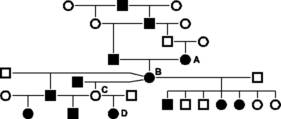 - C (unaffected) is the daughter of two affected individuals. As we lack data on sibs, we cannot establish whether this occurs about 25% of the time.