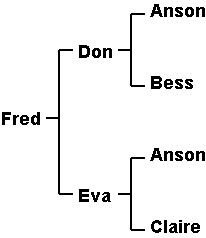 The most widely used approach for calculating inbreeding coefficients is Wright's "paths" method (see note), best illustrated by a simple example. Suppose we mate half-sibs, the common ancestor, Anson, being the father. Don is the son of Anson and Bess; Eva the daughter of Anson and Claire. Fred is one of their progeny.