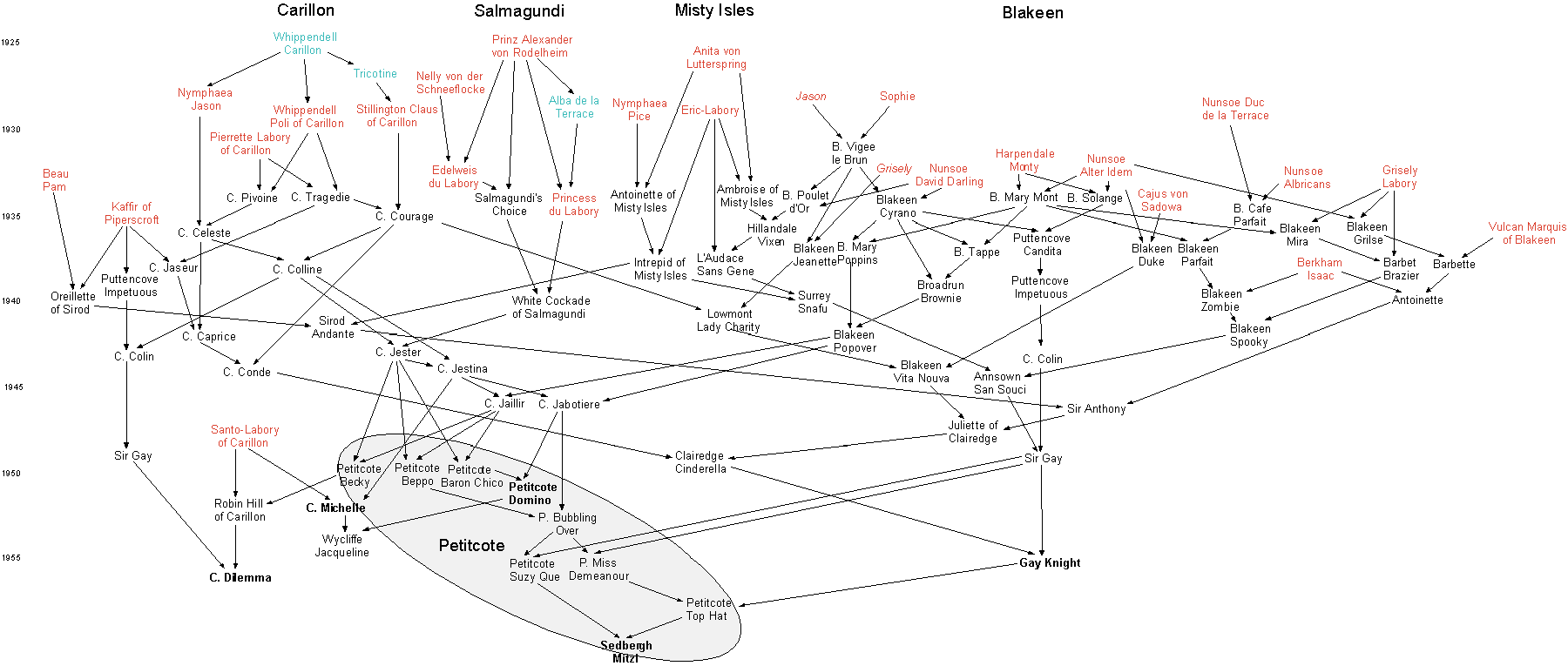 The pedigree, below, shows the lines of descent from the four major importers of Standard Poodles during the 1930s to Jean Lyle's Wycliffe Kennel in North Vancouver, and Sylvia Dempster's Petitcote kennel in Hudson Heights, Quebec.These major kennels were Carillon (Mrs. Whitehouse Walker, followed by Blanche Saunders), Salmagundi (Mr. & Mrs. Justin Griess), Misty Isles (Mrs. Byron Rogers) and Blakeen (Mrs. Hayes Blake Hoyt).