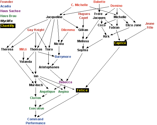 These three bitches (in red) - Babatte, Michelle and Mitzi - and the four dogs - Gay Knight, Hugues Capet, Dilemma and Domino - are, in effect, the "Wycliffe" founders, though Jean Lyle only owned Michelle and two of Mitzi's progeny, Yolanda and Yorick. Gay Knight and Dilemma were used by others, so that their contribution to the genetic heritage of a later individual may not entirely reflect Wycliffe breeding. However, I have yet to find a line that traces back to Babatte, Hugues Capet or Domino, except through Wycliffe.